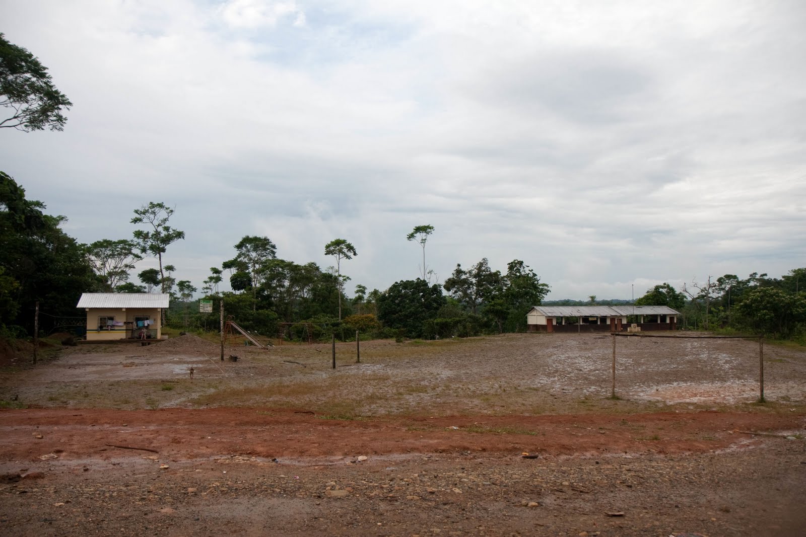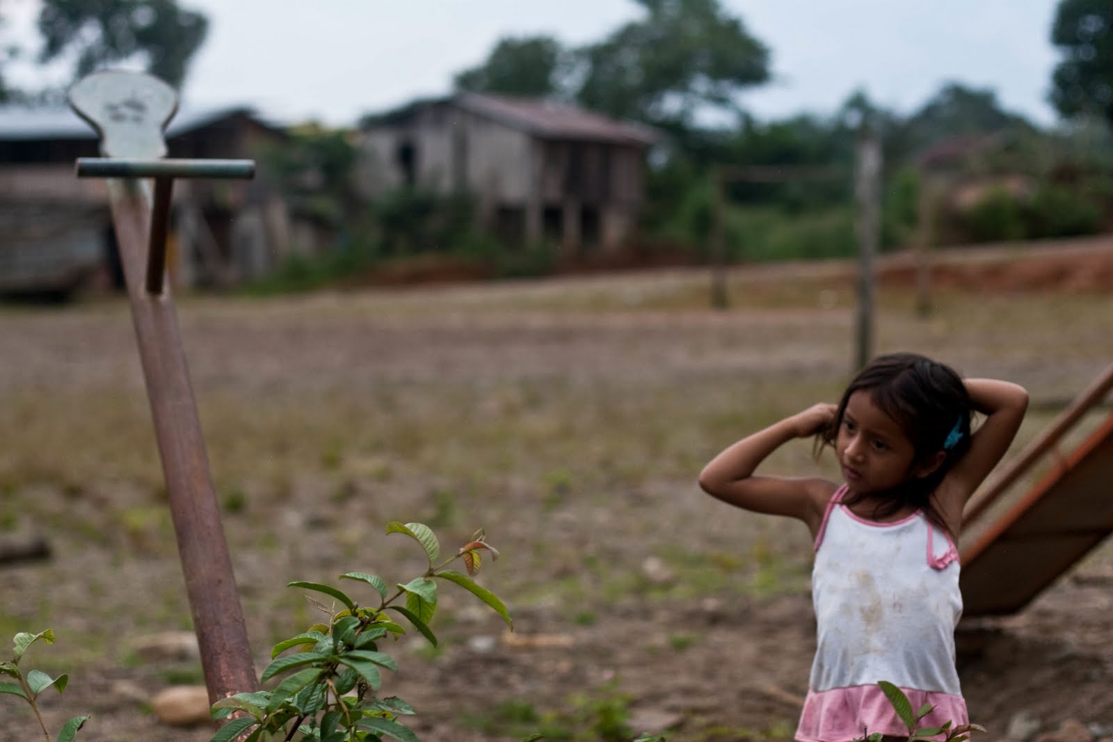 Las Salinas no es mucho más que un puñado de casas (sesenta familias en total) diseminadas entre la selva a lo largo de doce kilómetros, siguiendo la margen del río, y unidas entre sí por trochas de tierra y fangosos senderos de piedras que buen trabajo ha costado abrir. No hay luz, ni agua canalizada: recogemos el agua de la lluvia que siempre cae en tromba en algún momento del día o de la noche, y para bañarnos vamos al río, si no llueve. Si llueve tenemos que ir al pozo porque el río baja lleno de tierra y con riesgo de crecidas (el abuelo de Cárolyn murió así, ahogado en el río, y lo velaron una noche entera en la casa comunal, pero ella, que tiene nueve años, no se acuerda de cuánto tiempo hace de esto). A cambio de que en esta parte del río haya tanta corriente, en Las Salinas no hay anacondas, pirañas ni sanguijuelas como más abajo, donde el río se remansa. Más abajo, también, hay todavía guerrilleros de las FARC, paramilitares y soldados, que aquí ya se extinguieron. Sólo ochenta kilómetros más abajo mató el ejercito colombiano en 2008 al dirigente de las FARC Raúl Reyes, en territorio ecuatoriano, y nos han aconsejado que no descendamos el río en canoa, porque fácil nos pueden confundir con guerrilleros, y pegarnos un tiro desde la otra orilla.