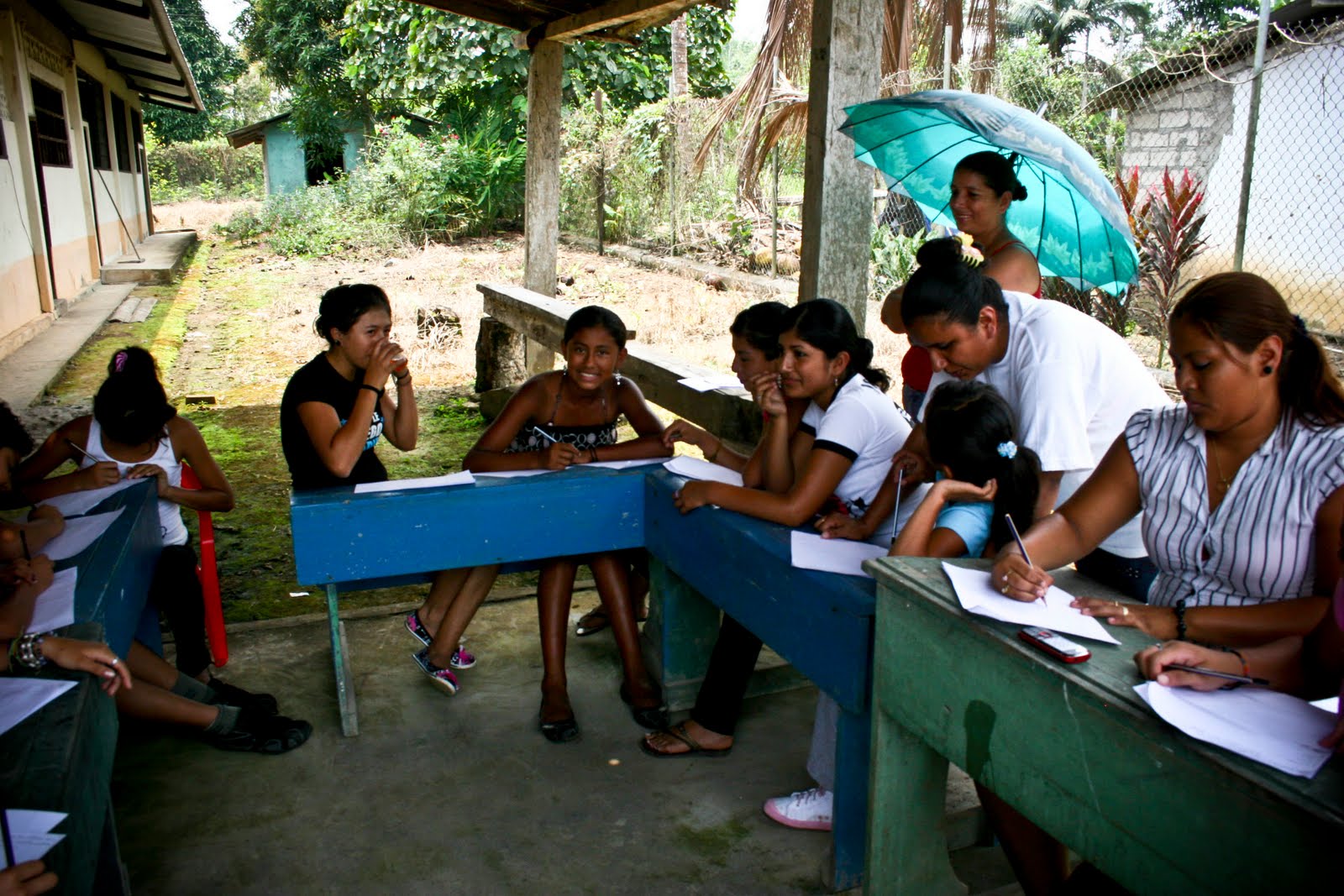 El Mirador es un pequeña comunidad situada a cinco kilómetros de Shushufindi, una de tantas localidades petroleras de Sucumbíos, relativamente lejos de la frontera. El Mirador ha crecido a lo largo de la carretera, y es fácil llegar a ella en transporte público. Hay agua corriente y tendido eléctrico. Hay alguna tienda de abarrotes, un cyber con conexión a internet y una enorme escuela con muchas aulas y un patio de recreo. En el Mirador hay una iglesia y una biblioteca pública, con libros y un televisor con DVD. Entre el patio del recreo y el aula de catequesis de la iglesia (las aulas de la escuela las estaban reformando, aprovechando la vacación estival) montamos nuestras JORNADAS DE TEATRO ALEGREMIA. Dormimos en la Biblioteca, donde apartamos las mesas y montamos nuestros colchones y nuestras mosquiteras. Allí podíamos ver documentales en DVD y ducharnos en un cuarto de baño. Comíamos en casa de Alfredo y Verónica, que han sido amabilísimos con nosotros, y en cuyo jardín montamos una noche un karaoke y una sesión de salsa que resultó muy divertida. Carlos, el presidente, y su mujer estuvieron siempre pendientes de nosotros. En el Mirador hemos estado muy cómodos, y hemos trabajado muy bien, pero yo sigo recordando Las Salinas.