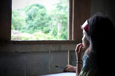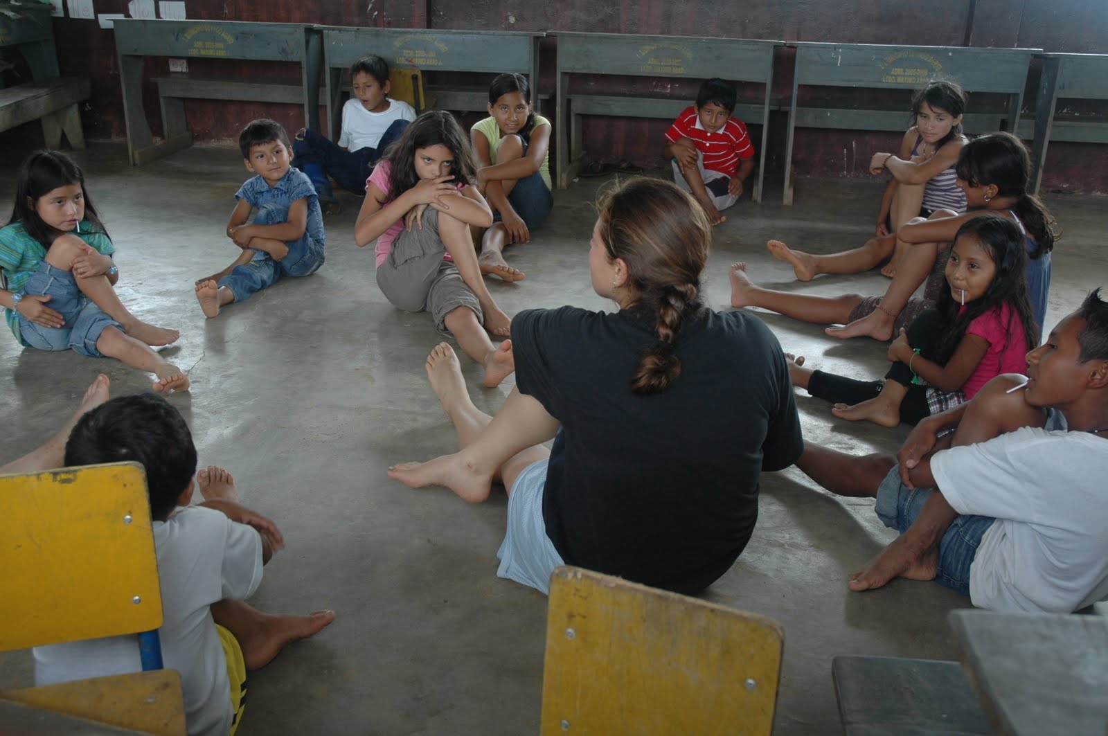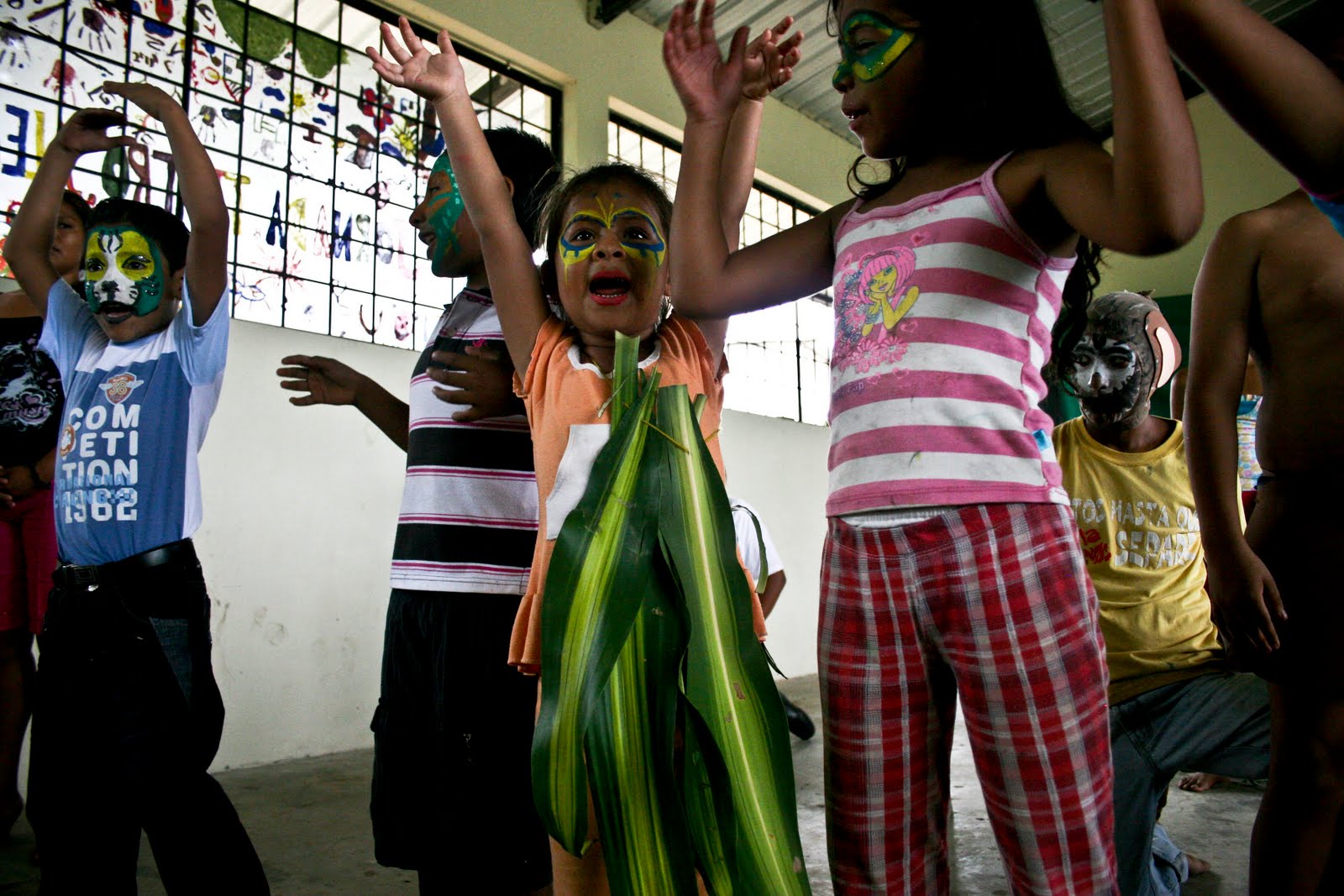 Los niños y adolescentes de El Mirador son cariñosos, abiertos y tienen un aceptable nivel académico. Fue fácil organizar con ellos la sesión de escritura de cuentos, y no tuvieron inconveniente en leer cada uno el suyo en voz alta ante un público formado por el resto de cooperantes. Son conscientes de los problemas de la zona, sobre todo de la contaminación petrolera, que aparece en todo momento en los escritos, pero conocen las estructuras narrativas y plantean con facilidad finales felices, incluso a veces, en los cuentos de las más mayores aparece el inevitable romance. En esta ocasión el argumento de la obra surgió por consenso, a partir de dos de los cuentos escritos, y el segundo día, ya con los ensayos iniciados, tuvimos una especie de asamblea para decidir el final. Un niño se cría en la selva y es educado por todos los animales. El oso le enseña a comer frutos silvestres y a pescar. El mono le enseña a descolgarse por los árboles. El tigre le enseña a caminar sigilosamente. Las plantas le enseñan a curar sus heridas. El loro le enseña a hablar y, por último, tras un poco de esfuerzo, los pájaros le enseñan a volar.