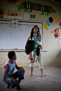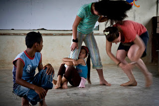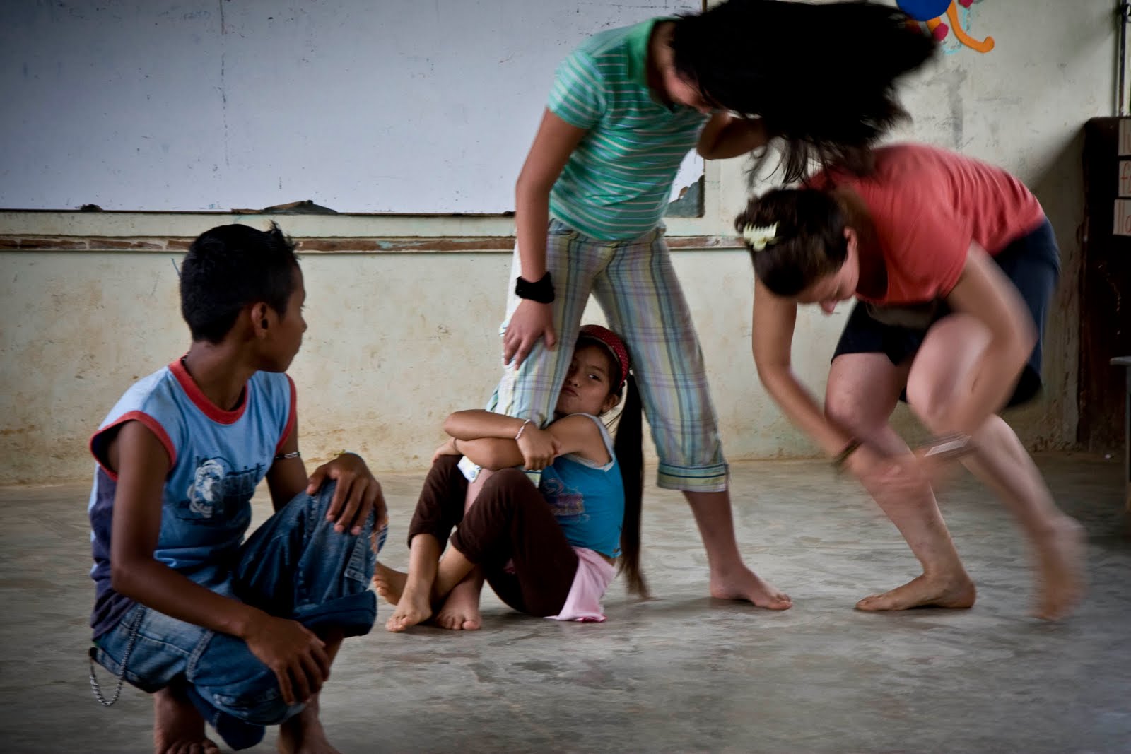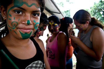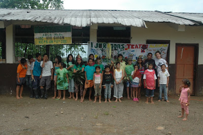 Las jornadas de teatro ALEGREMIA es un proyecto de Diana Civila, directora de la compañía de teatro LA OFENDIDA PRODUCCIONES y coordinadora de los viajes solidarios de ASPA, realizado en colaboración con ACCIÓN ECOLÓGICA, una de las organizaciones con las que colabora ASPA en Ecuador. El objetivo es contribuir, a través de la práctica del teatro, a aumentar la autoestima, la capacidad de liderazgo y, sobre todo, la capacidad de disfrute de los niños y niñas de distintas zonas de Sucumbíos, una zona especialmente dañada por la contaminación petrolera, como seguiremos viendo, y por conflictos fronterizos. La primera experiencia se realizó en la Comunidad de Las Salinas, comunidad de la que ya he hablado en entradas anteriores. A Diana, Mati, Olga y a mí (los viajeros solidarios de ASPA) nos acompañaron Carolina Valladares, joven socióloga representante de ACCIÓN ECOLÓGICA; Paúl y Heidi, profesores de un colegio de Cuenca (Ecuador), que habían decidido colaborar en el proyecto y aprovechar para establecer un intercambio con algunos de sus alumnos; y Pedro, Nicolás, Ivana, Carolina y María José, alumnos de diez años de Paúl y de Heidi que habían estado carteándose con niños de Las Salinas y venían ahora a culminar esta experiencia de intercambio (y, claro, a participar en el teatro). Durante toda la semana que estuvimos allí, los juegos cooperativos y de desinhibición propuestos por Paúl y por Heidi contribuyeron mucho a crear grupo y romper la barrera de la timidez entre unos niños que resultaron aplicados y cariñosos, pero muy cerrados, faltos de inciativa y, sospecho, de autoestima .