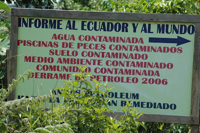 Perdí las fotos de la finca de doña Delia, y Mati tampoco tiene. Así os ahorráis la visión de los criaderos de peces abandonados, y de la casa en ruinas y rodeada de charcos negros, en la que ella vivía. Fue en el derrame de 2006, y hasta el momento doña Delia, que ha tenido que mudarse, sólo tiene el consuelo de haber colgado este cartel, proporcionado por Acción Ecológica.