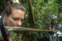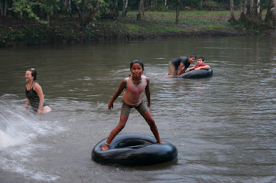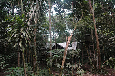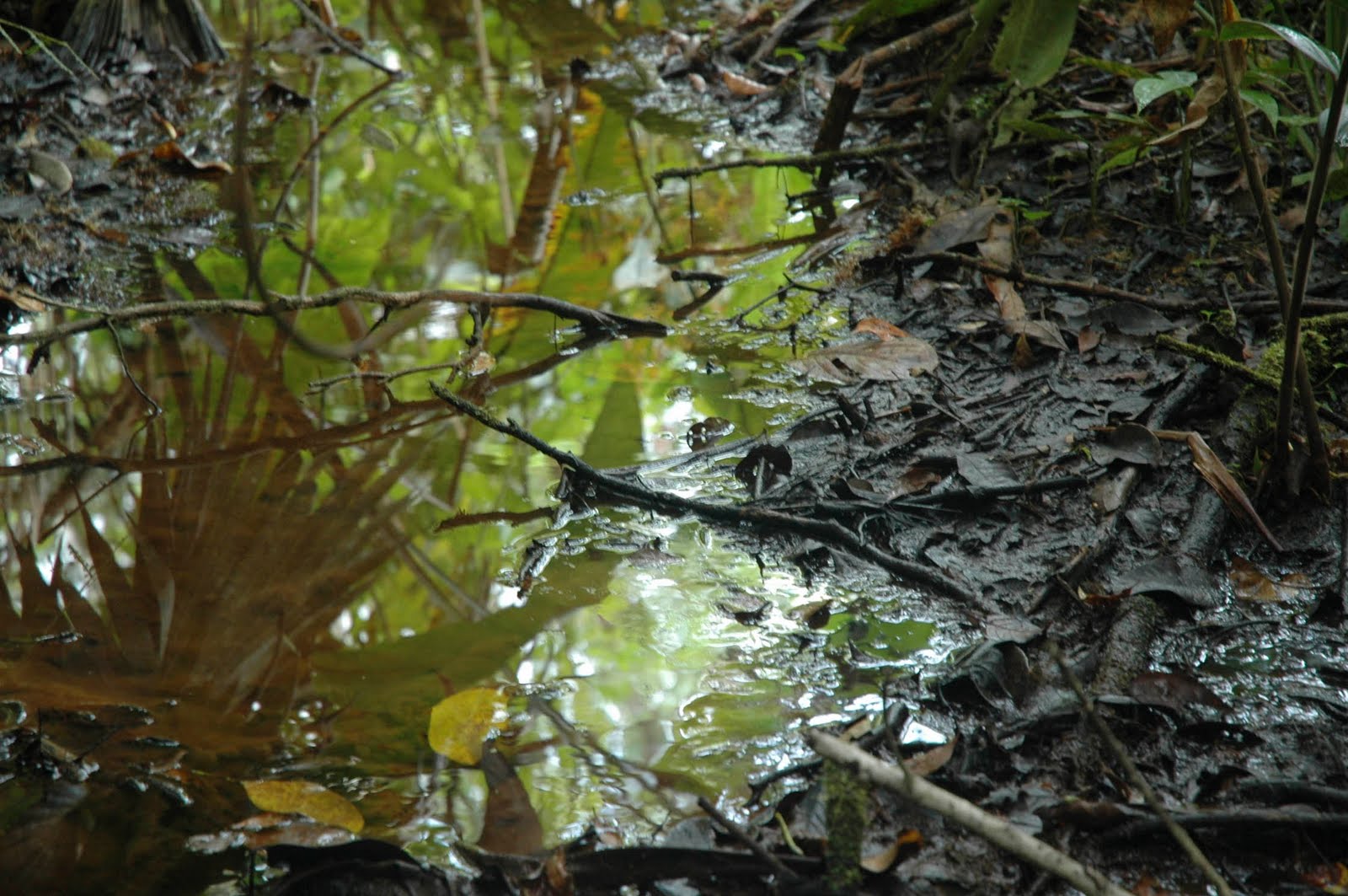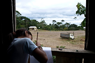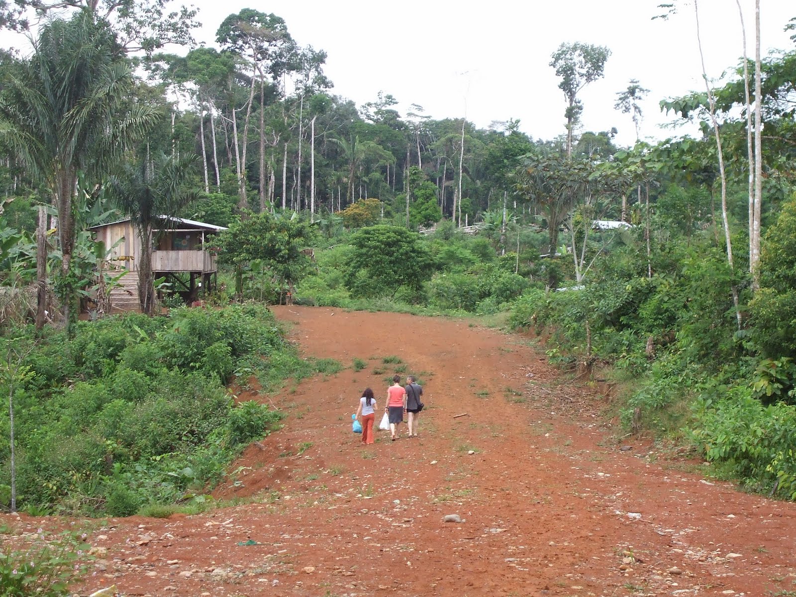 Se me olvidaba decir que en El Mirador hay un chiringuito donde es una delicia sentarse al atardecer a beber cerveza, con un río sin contaminar donde es un delicia bañarse, y un descampado donde es una tortura jugar al futbol descalzo, pero lo compensa las innumerables veces que tiene uno que tirarse al agua para buscar el balón. Los miembros más activos de la comunidad están buscando financiación para montar aquí un proyecto hotelero. Sería difícil encontrarla, porque el proyecto es muy ambicioso e incluye sauna, salas de spa y un teleférico para subir al monte. Piensan que sin esos atractivos nadie querría venir aquí. Intentamos convencerlos de que están equivocados. Que un proyecto de ecoturismo con senderismo guiado por los montes, y comida ecológica (hemos disfrutado de unos jugos naturales, un pescado y una cocina amazónica extraordinaria, gracias a Verónica y sus hermanas) tendría mucho más éxito, y que los turistas valorarían enormemente esta naturaleza virgen y amable, que es lo que en sus países ya no tienen. Parecieron dejarse convencer, y Carolina quedó con ellos en hablarlo en la próxima Clínica Ambiental. Con un poco más de cohesión comunitaria y apego por la tierra, El Mirador podría ser un símbolo de la felicidad. Claro, mientras no lleguen aquí los vertidos y las aguas de formación.